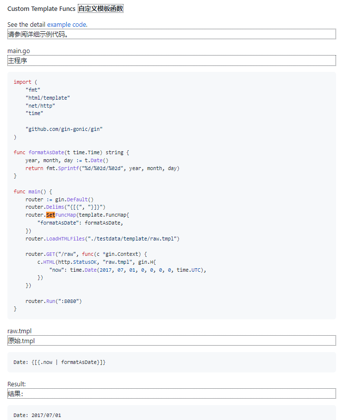 自定义模板函数(自定义Model) - 用于html中的方法, 需要使用router.SetFuncMap(template.FuncMap{ }) 来注册。