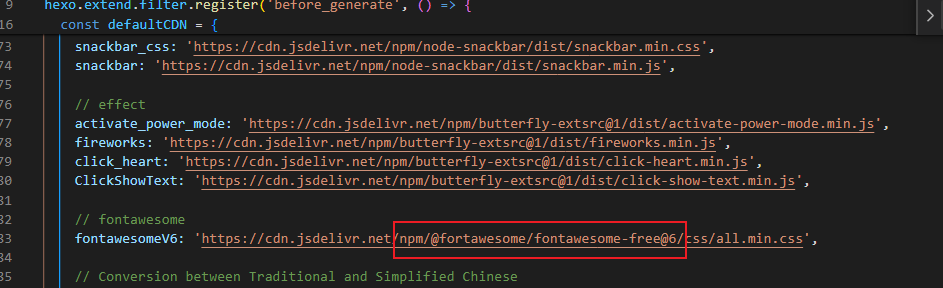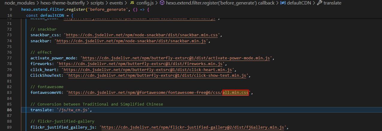 这个地址肯定要换, 本着尽量避免改动主题代码的原则(毕竟在主题源文件中改了哪个0文件,就得把改的这个文件纳入版本控制以备我多设备写博客时部署博客的一致性以及博客持久化的需求), 就先去翻看了butterfly的官方文档, 发现其配置文件_config.yml中果然暴露的有修改cdn地址的配置项(一下省了很多事儿)。