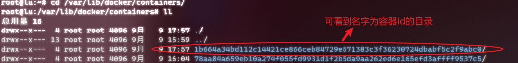 cd /var/lib/docker/containers/-> 打开容器存放目录![]()