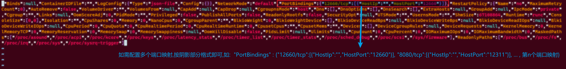 vim 容器id/hostconfig.json-> 修改/新增 端口映射相关参数> 注意: "端口号/tcp" 对应容器的端口, "HostPort":"端口号" 对应的是宿主机的端口