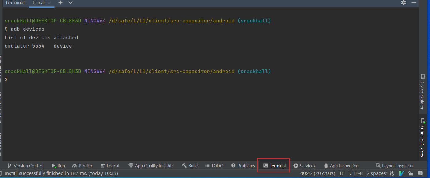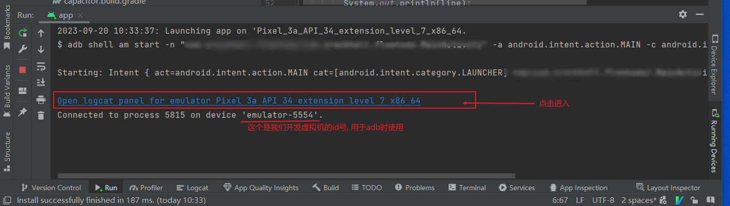 可在android studio内的终端, 或任意终端中, 使用adb命令调试开发虚拟机, 我们可以用