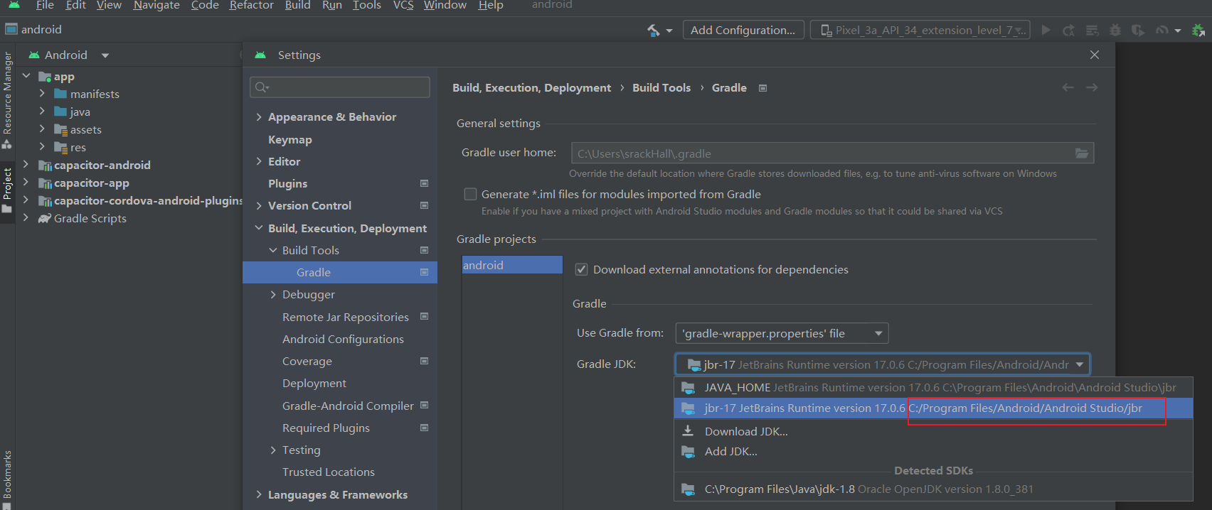 基于上述原因, 我删除了安卓java8是配置的JAVA_HOME的环境变量的value, 并将value重新配置为与Android Studio IDE 中所示的, 由IDE自动下载适配的版本。(即将图中所显示gradle路径配给了JAVA_HOME环境变量的value)