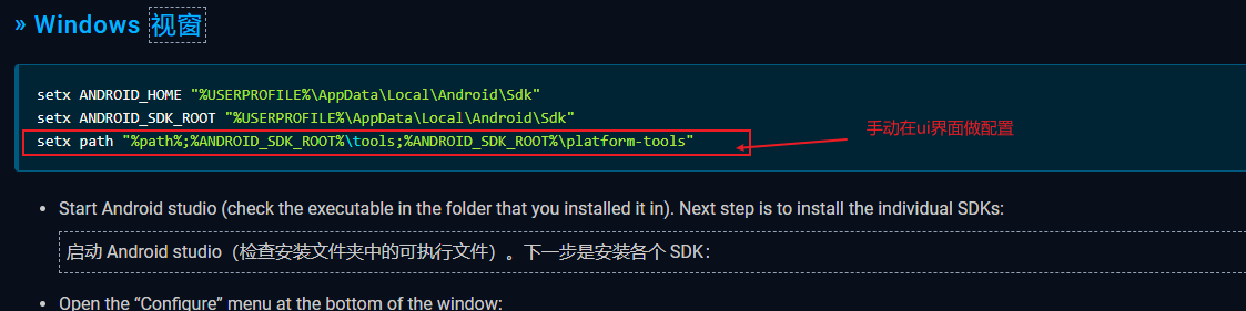 需要注意的是, 对于下图中所述的第三条命令, 最好通过手动的方式在ui窗口设置, 否则会覆盖掉你系统中用户变量下原有的path的已配置变量。