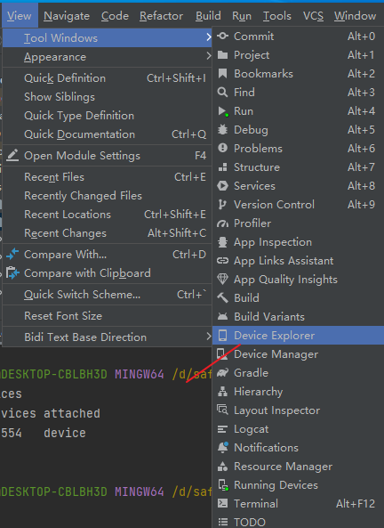 在android studio内的view窗口, 查看虚拟机内的文件系统, 打开方式如下图:
