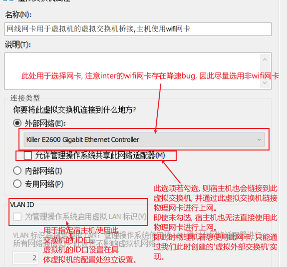 因此, 我建议在创建’外部虚拟交换机’时, 选择虚拟交换机所依赖的网卡为’物理网线网卡’, 而避免发生inter网卡的速率下降bug。