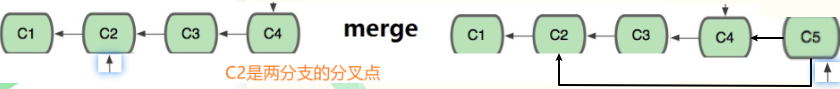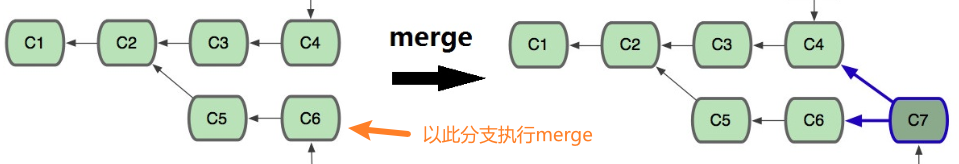 • 若强制merge时的提交为非快进式提交的话(指定参数--no--ff), 就一定会在全局视野下产生一个全新的commit项, 在此情况下此单一的全新提交中所包含的内容是从分叉点至最新提交之间的所有更改内容(如例图中的C5)。 (一般可用于主分支处理pr时, 可以参考文章<<GitHub Merge Pull request 的三个选项说明>>其中有一部分对非快进式提交进行了运用)