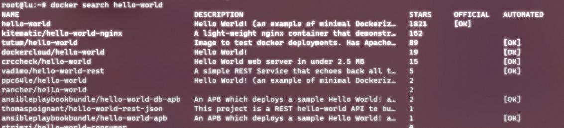 列头 含义 NAME 镜像名称 DESCRIPTION 镜像说明 STARS 点赞数 OFFICIAL 是否官方认证 AUTOMATED 是否是自动构建的
