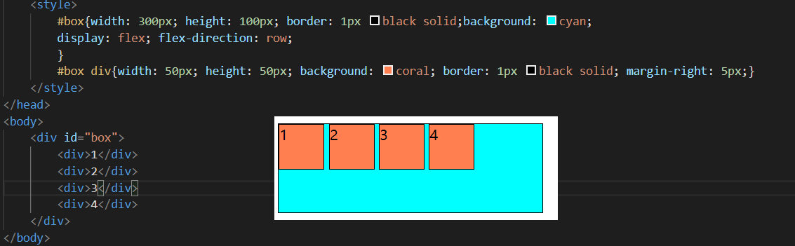 加入”display:flex”语句后, 默认值为水平从左往右排列布局如图所示
