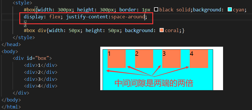 • space-around: around是环绕的意思,意思是每个flex子项两侧都环绕互不干扰的等宽的空白间距,最终视觉上边缘两侧的空白只有中间空白宽度一半。