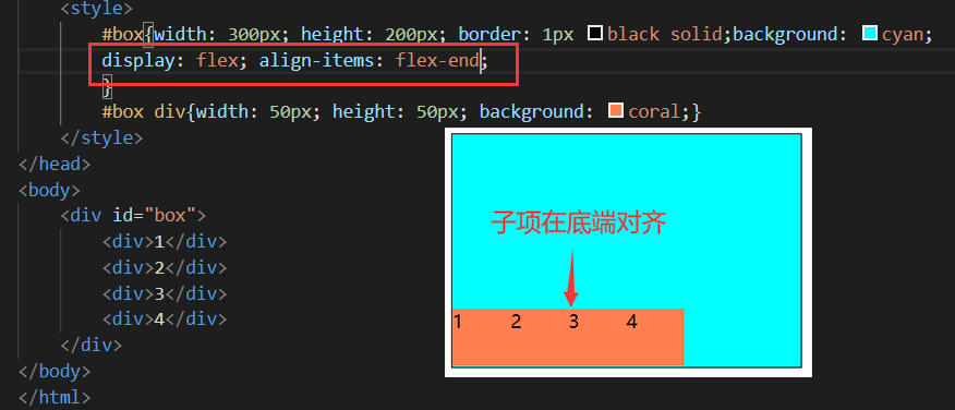 • flex-end:子项在垂直方向底端的位置对齐