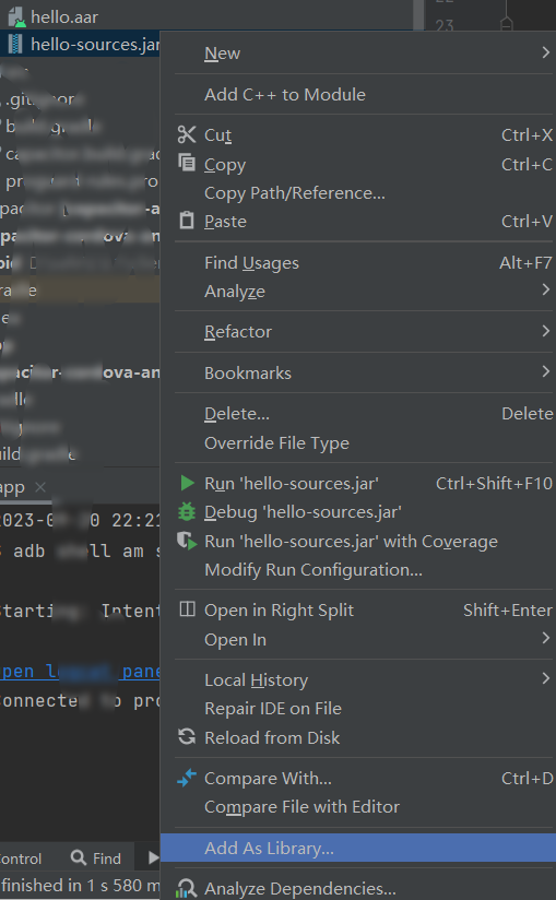 代码添加后, 我们可在.jar文件上右键, 选择Add As Library..., 如下图
